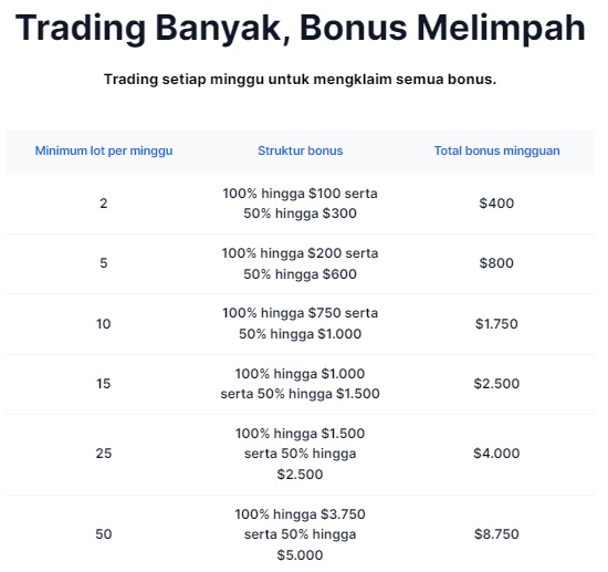 15 tahun bersama XM hadir dengan kejutan besar bagi Anda para trader! Nikmati bonus setiap minggu bersama XM. Semakin banyak Anda trading, semakin besar bonusnya.